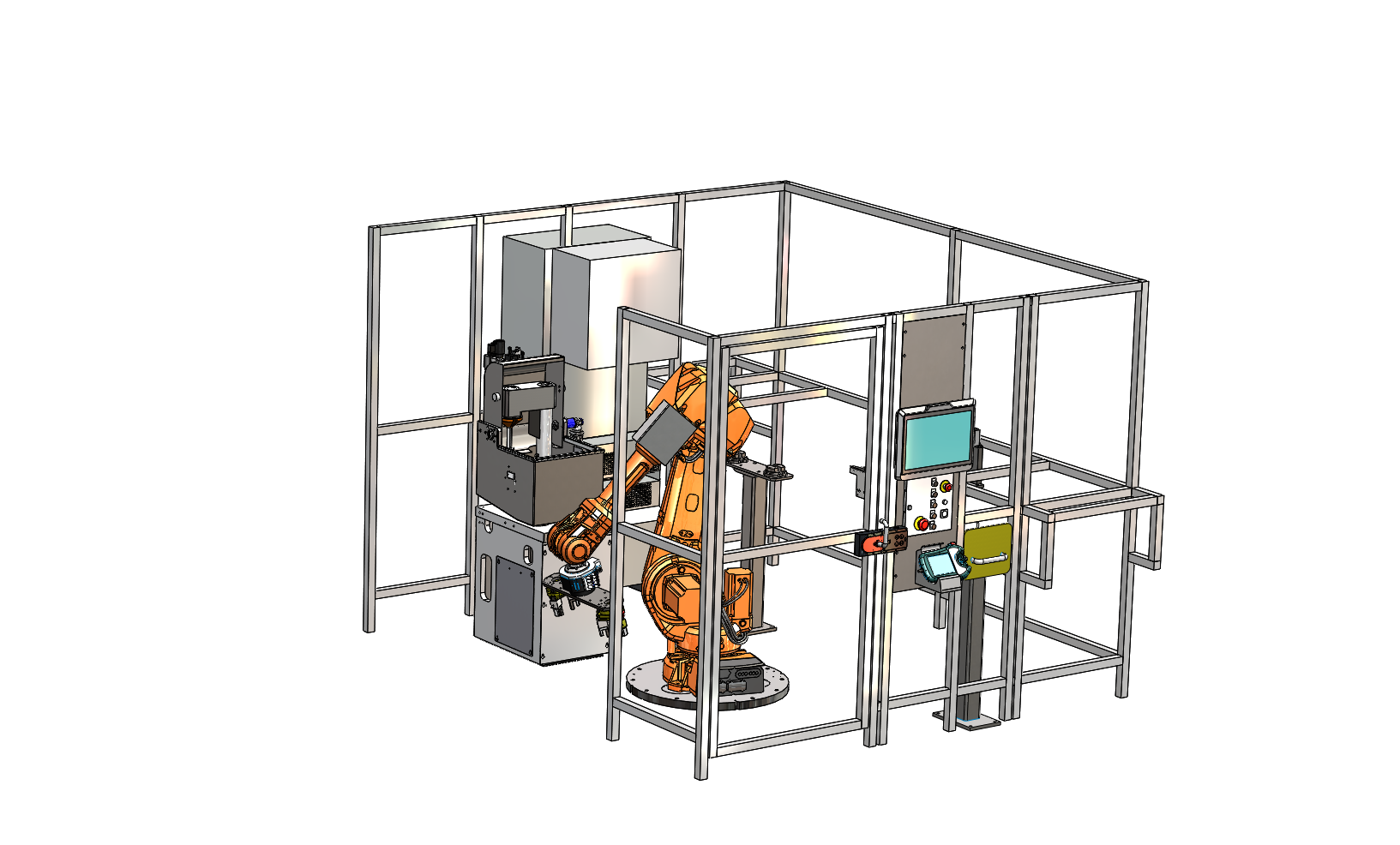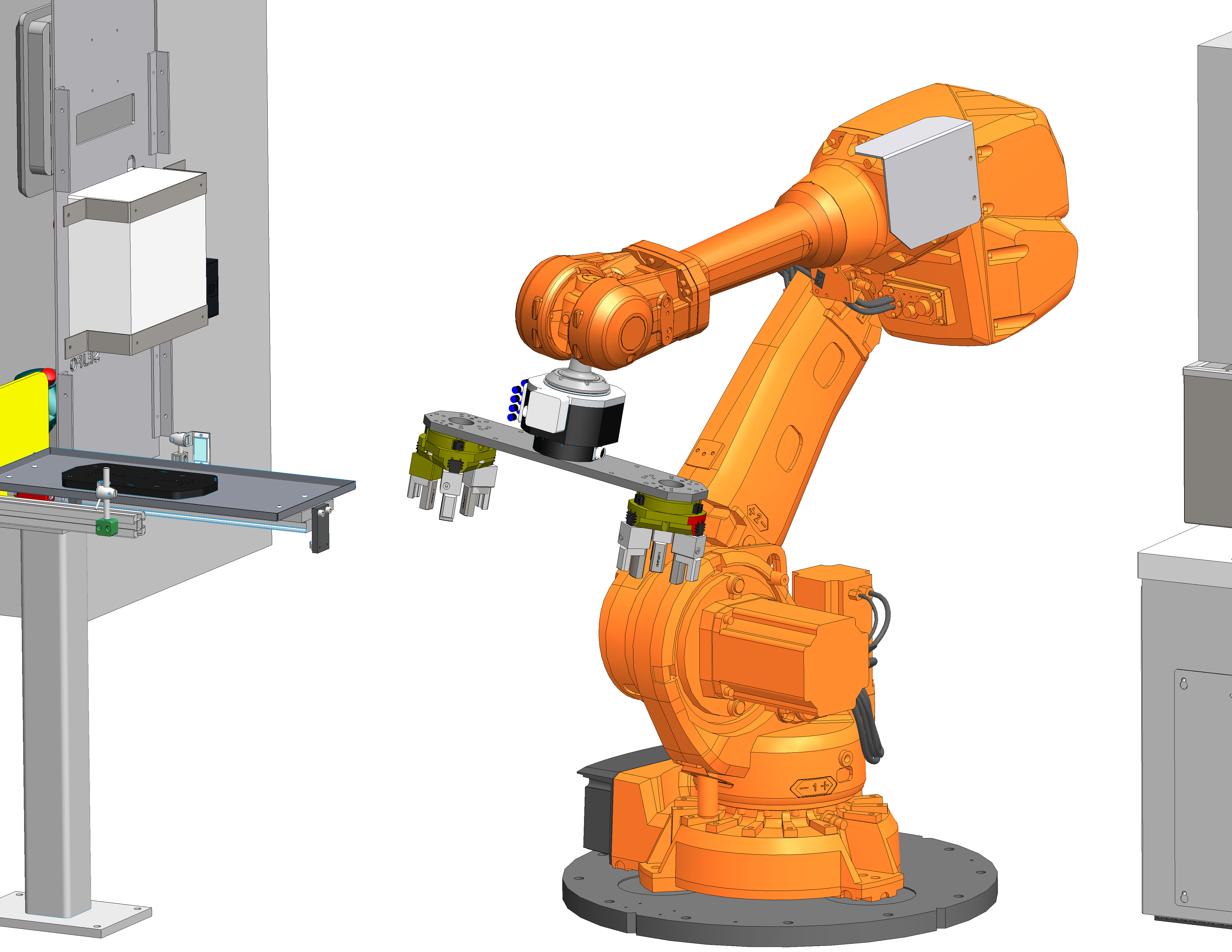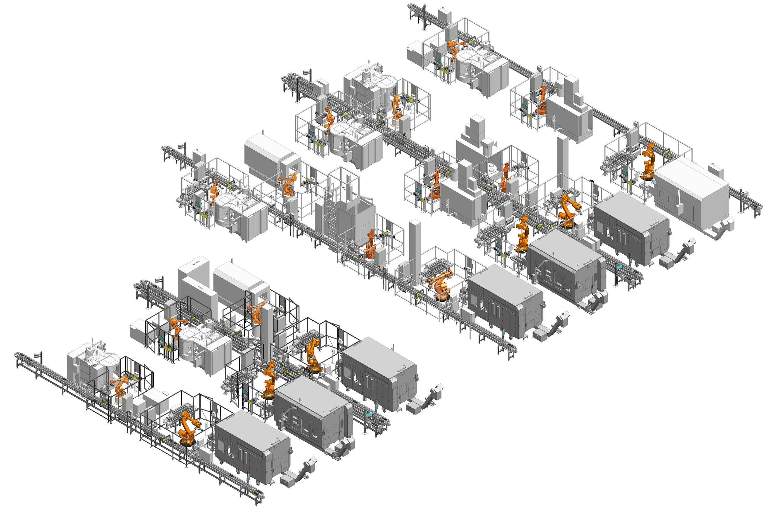 Varje linje består av en palettbana (Flexlink) med robotar som förser maskiner med produkter.